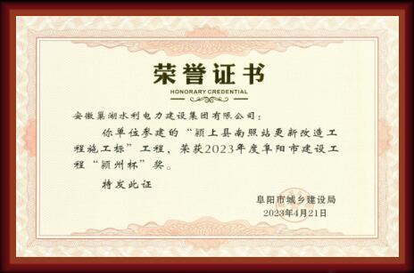 穎上縣南照站更新改造工程施工標工程榮獲“穎州杯”獎