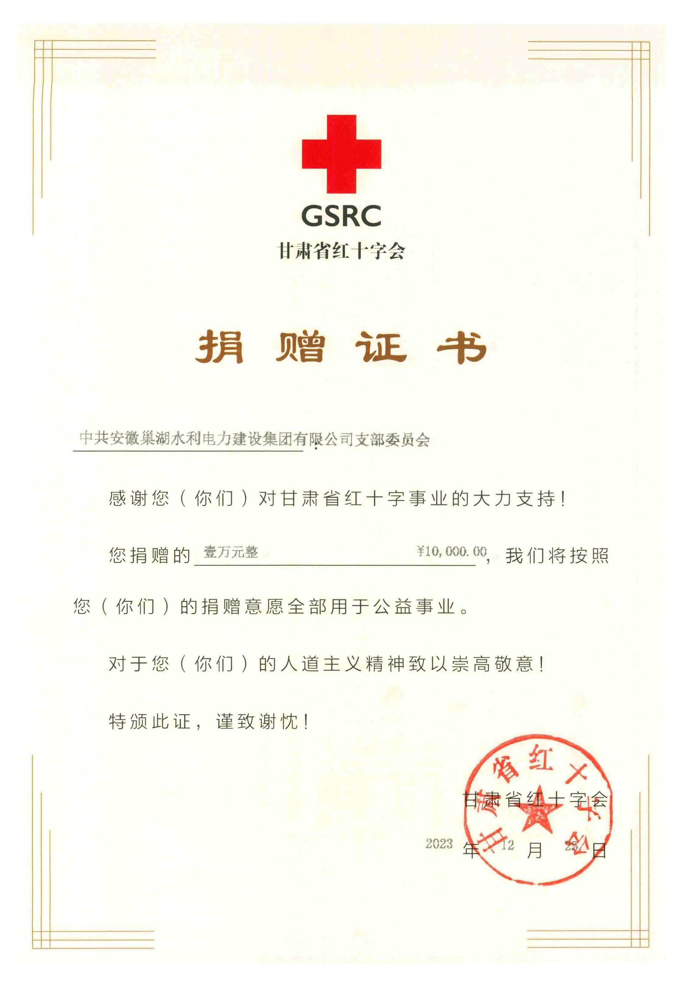 為支持災(zāi)區(qū)人民抗震救災(zāi),安徽巢湖水利電力建設(shè)集團(tuán)有限公司第一時間發(fā)出倡議書,號召廣大黨員干部、職工積極捐款,充分履行企業(yè)責(zé)任擔(dān)當(dāng)。12月22日上午,安徽巢湖水利電力建設(shè)集團(tuán)有限公司舉行向甘肅地震災(zāi)區(qū)捐款活動,公司領(lǐng)導(dǎo)帶領(lǐng)全體員工積極參加捐款,大家同心協(xié)力、眾志成城,將愛心奉獻(xiàn)給災(zāi)區(qū)人民。在此次活動中,公司和黨支部分別捐款5萬元和1萬元,捐款將通過甘肅省紅十字會及時送到交區(qū)人民手中,幫助災(zāi)區(qū)人民共渡難關(guān)。12月25 日公司收到了來自甘肅省紅十字會分別向公司和公司黨支部發(fā)來2本捐贈證書。千言萬語繪制成一紙證書,記錄安徽巢湖水利電力建設(shè)集團(tuán)有限公司全體員工與受災(zāi)群眾風(fēng)雨同舟、團(tuán)結(jié)一心、共克災(zāi)情。希望我們每個人的微小之力,積水成淵,用我們的愛心溫暖了這個冬天。