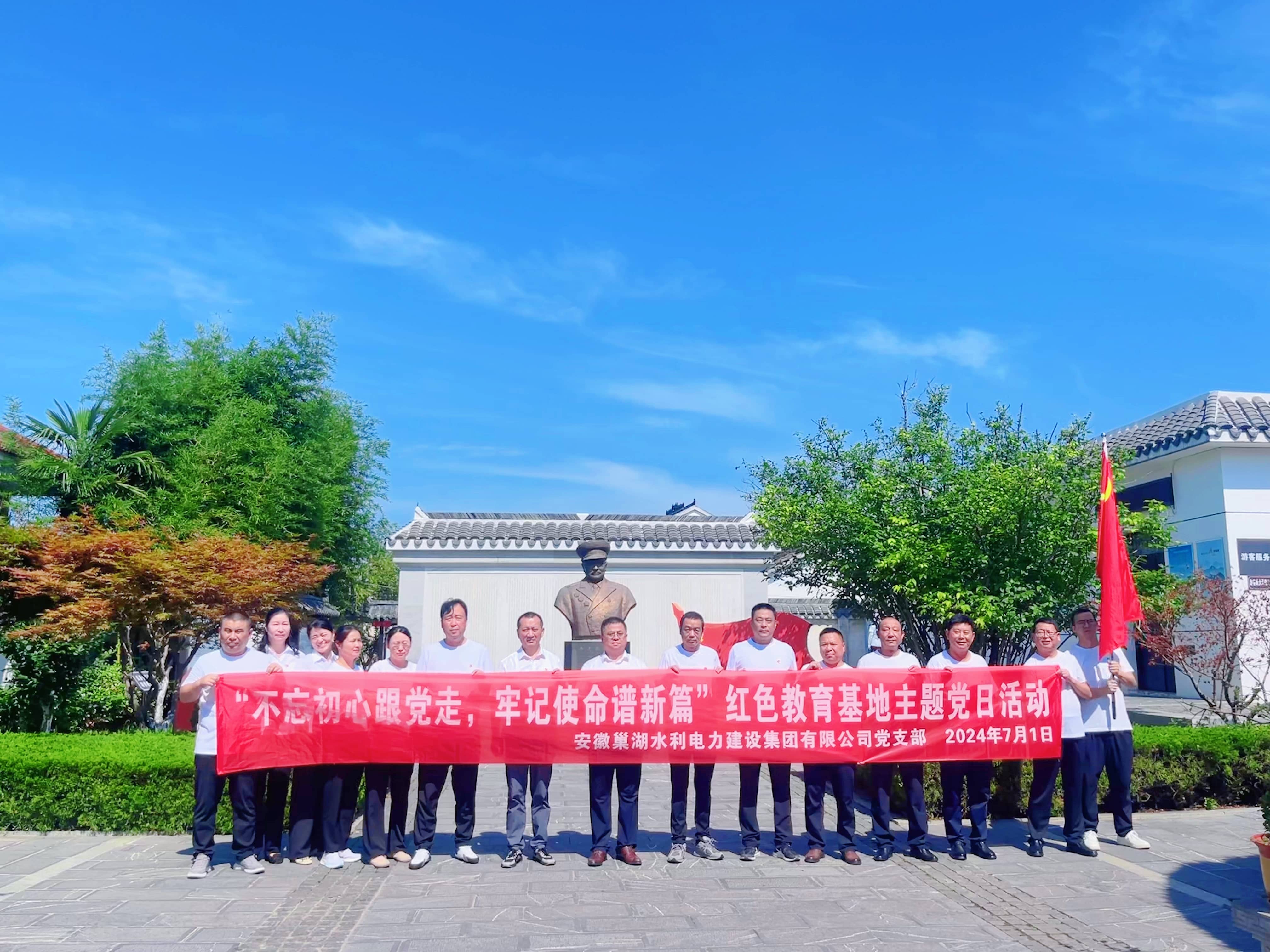 在七一建黨節來臨之際,為慶祝中國共產黨成立 103周年,深入貫徹黨的二十大精神,合肥市安徽巢湖水利電力建設集團有限公司黨支部精心策劃組織了 “不忘初心跟黨走,牢記使命譜新篇” 主題黨日活動。公司黨員同志們懷揣著對革命先輩的崇敬,踏上了這場意義非凡的紅色之旅。